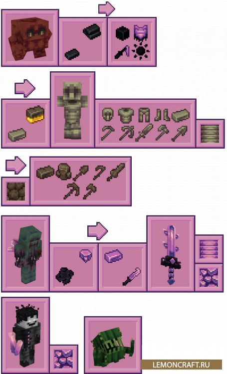 Мод на новую броню Pleh-emstruhtee добавляет в игру новый вид брони, а так же, четырех новых мобов. Моды достаточно опасны, так что будьте осторожны. Но победив данных мобов вы получите качественную броню и инструменты. Текстуры, как самих мобов так и получаемых вещей достаточно красивы, что будет радовать ваш взгляд во время игры.